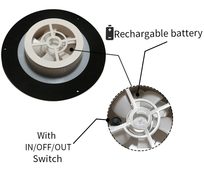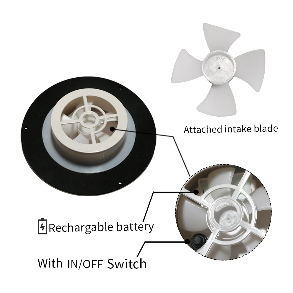 * Ventilator med uppladdningsbart batteri och strömbrytare.